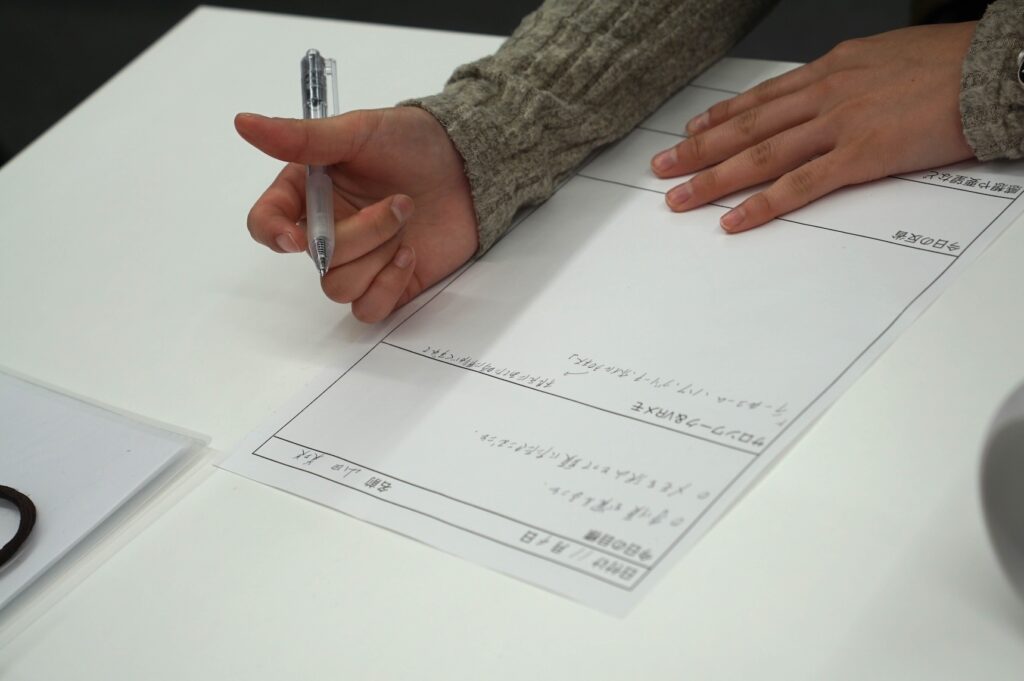 坂田「例えば1周目見るときは、とりあえず手順、触る場所だけをメモとって、2周目はその書いたメモの横にその時のスライスの角度とか、手の角度、刷毛のタッチ数とか、そういう細かいところを書くとか。私はそんな方法で使っています」